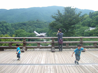 登廊の入り口付近で子供の写真を撮る・・・